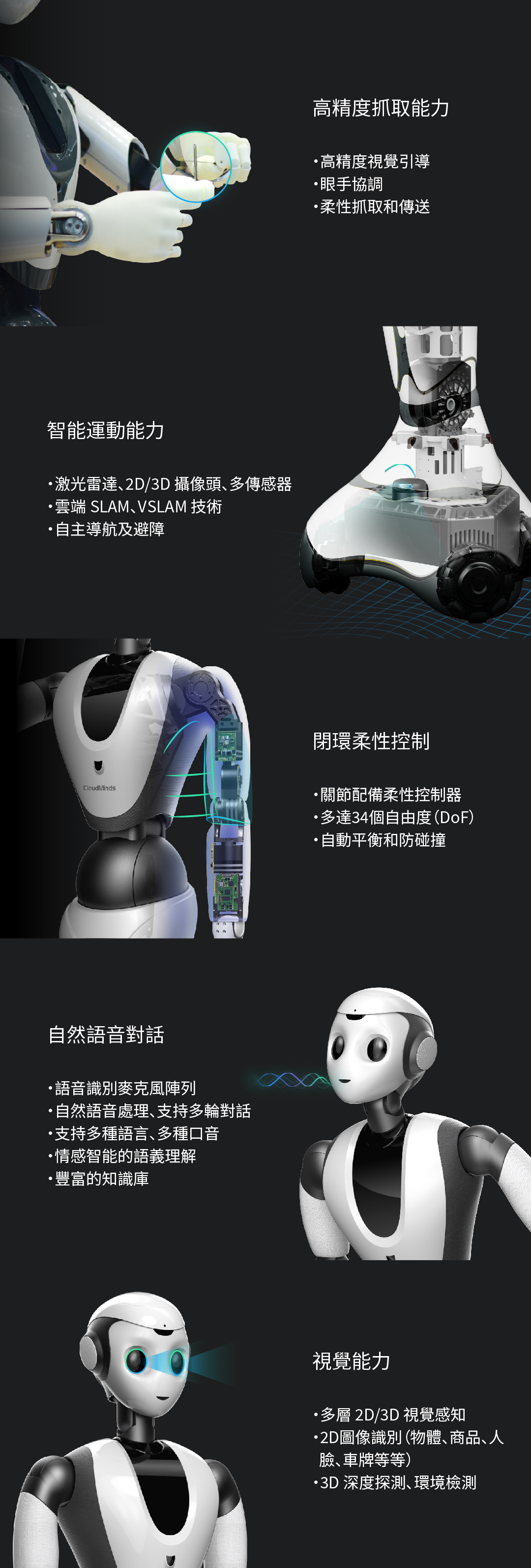精準的視覺抓取能力、全方位的聽、說、看、動等融合智能能力。
